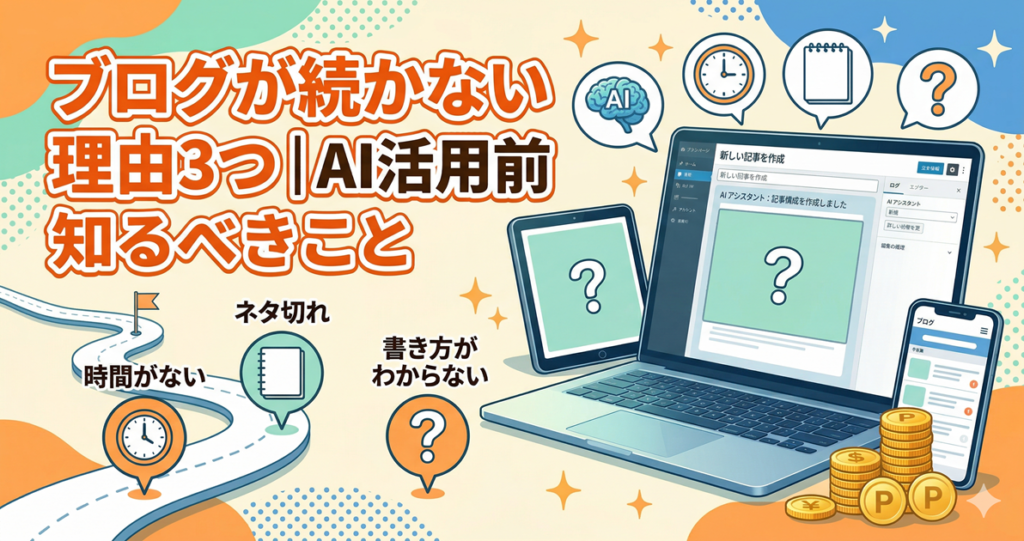 ブログが続かない理由3つ|AI活用前に知るべきこと※本記事にはアフィリエイト広告(PR)が含まれます。リンク経由でお申し込みがあった場合、当サイトに報酬が発生することがあります。「ブログを始めたのに、なぜか続かない…」そんな悩みを感じている人は... -